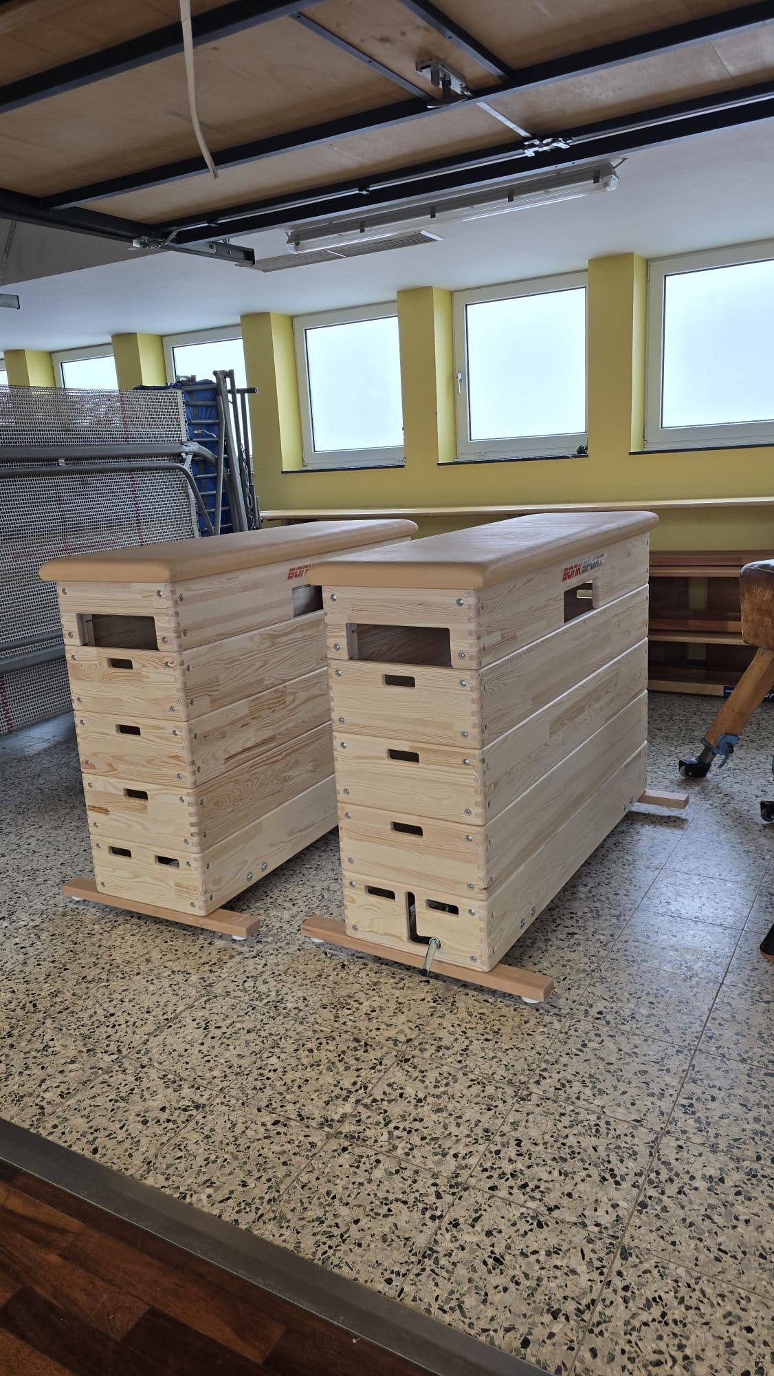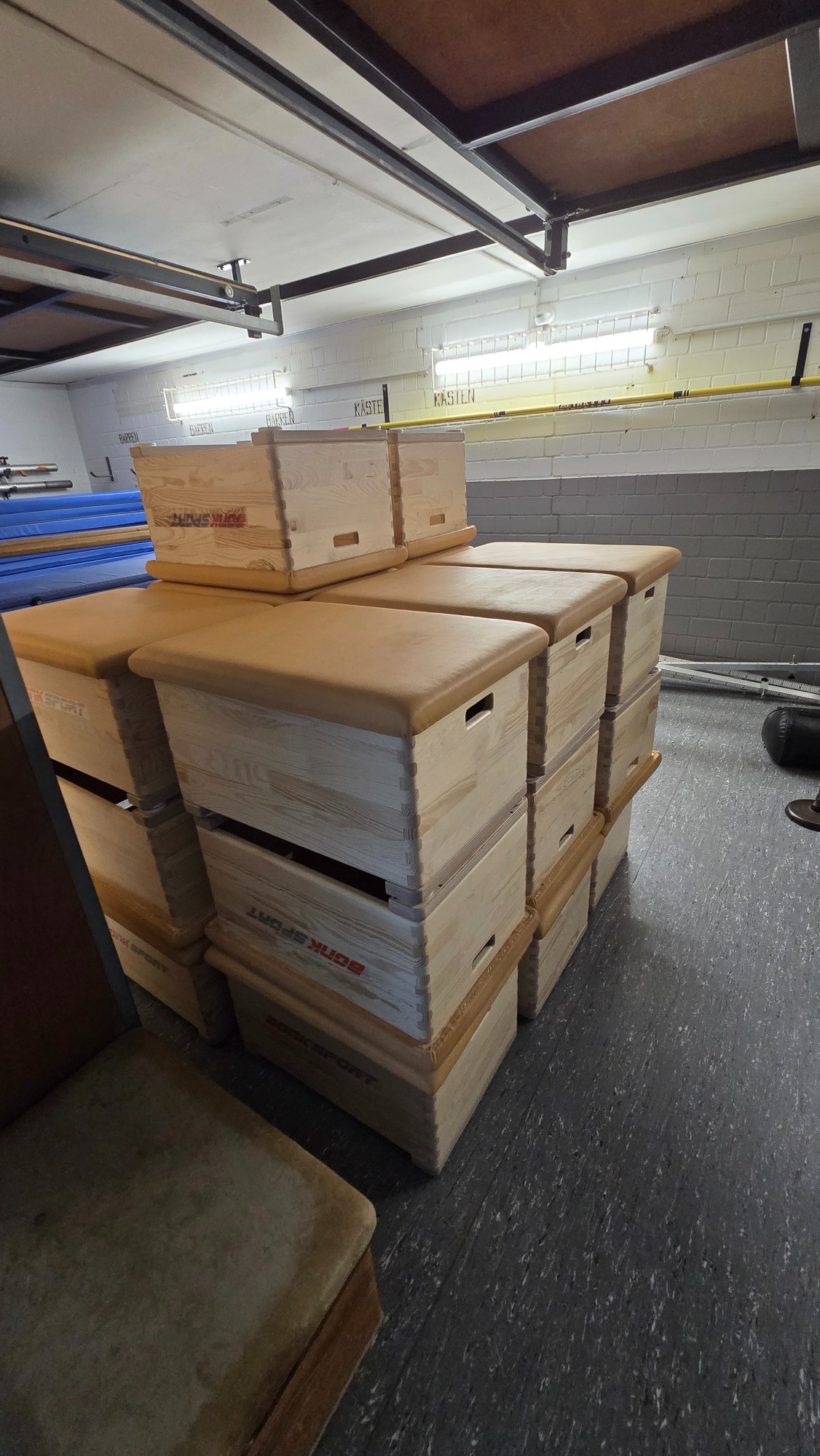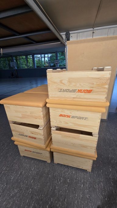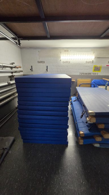 Zum Beispiel: Sprungkästen, Turnmatten, Turnbock, Sprungbrett, Trampoline, Bälle, u.v.m.