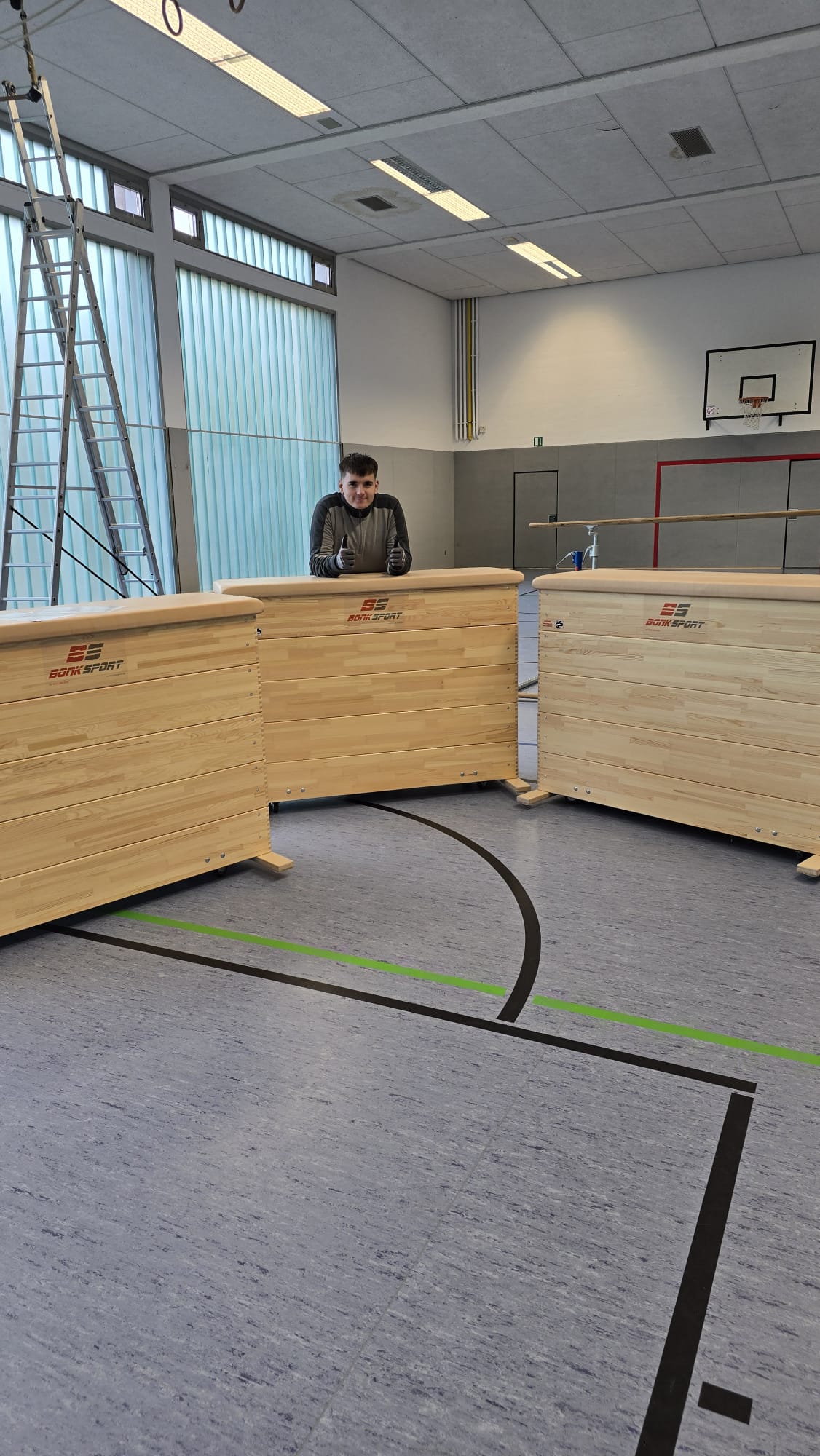 Wir liefern alles mit unserem Werkstattwagen + großem Anhänger. Bei Großlieferungen kommen wir mit einem LKW bis zu Ihrer Turnhalle / Außensportanlage, für uns ist das alles kein Problem!